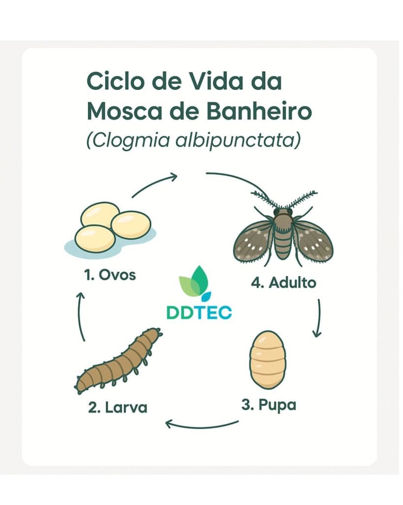 O ciclo biológico da mosca de banheiro, da espécie Clogmia albipunctata, é composto por quatro estágios principais: ovo, larva, pupa e adulto. Esse processo ocorre principalmente dentro dos encanamentos, onde há umidade constante e presença de matéria orgânica, fornecendo um ambiente ideal para o seu desenvolvimento.